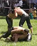 Wrestlers wear hand stitched leather trousers called kisbet and are drenched in olive oil before the match as this makes it more difficult to gain a grip on your opponent. The rule of grease wrestling are the competitors need to protect their own kisbet while trying to attack his challenger. To gain hold the wrestlers will go down the back of their opponents uniform. Winning using this move is known as paca kazık. The other rules are not to 'show his navel to the heavens'. If you laid down with belly facing the skies , you lose.