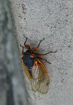 Some cicada species are colorful. Magicicadas have black bodies, red eyes, and wings with orange veins. Near the tip of each forewing is a black "W". The species Okanagana is colored black and orange. “Stop-and-go" cicadas of Ecuador have wings with red and green markings. Some cicada species are odd looking. The male bladder cicada of Australia has a large, balloon-like abdomen.