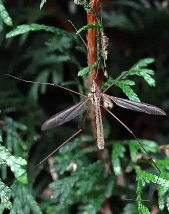 The crane fly is sometimes called "mosquito hawk" or "mosquito lion." Despite this ferocious name, it does not actually eat mosquitoes. The larvae of crane flies occur in moist soil, forest leaves and wood litter and in aquatic habitats associated with organic matter, depending on the species. Most species are generalist detritivores, but a few may feed on living plant tissue, such as grass roots.