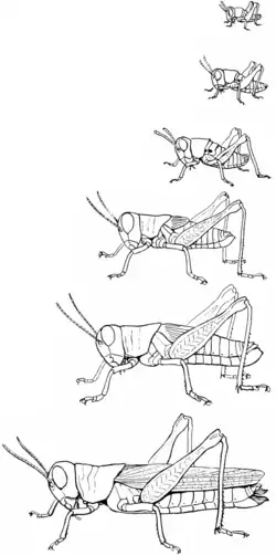 After they leave their eggs, newborn grasshoppers look much like adults. They simply grow bigger — if something doesn't kill it first. They will grow bigger by shedding their old skin as it gets tighter, in a process called moulting. As evidenced by the diagram on the right, grasshoppers have 6 stages, or instars, in its short life. Few young grasshoppers reach adulthood.