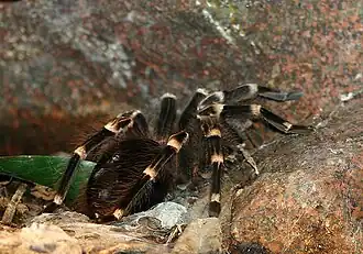 The Mexican Red-Knee Tarantula is native to parts of Central America. It has become endangered due to habitat destruction and pet-trade collection. It is one of the few arthropods protected under CITES laws (International Convention of Trade in Endangered Species).