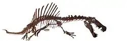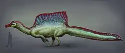 Spinosaurus is a very big theropod (meat-eating dinosaur) that lived during the Early Cretaceous period in North Africa. It is the longest theropod found so far. It is known for the tall sail/hump on its back and its croc-like face.