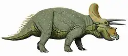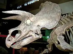 Triceratops means "Three Horned Face" in Greek. It is called that because it had three horns – two above its eyes and one on its nose. Triceratops horns could be up to 115 cm (45 inches) long. It had a big frill that extended up above the head.