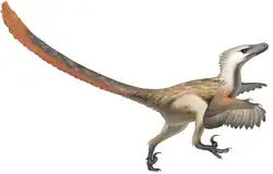 Velociraptor means "swift thief". This is a good name because Velociraptor was a small dinosaur that could run fast (up to about 64 km/h (40 mph)). It also could jump about 10 feet straight up. Velociraptor was a theropod. The theropods were a group of dinosaurs that walked on two legs. This group of dinosaurs are the ancestors of birds. Velociraptor brains were bigger than most other dinosaurs compared to the size of their bodies. Velociraptor was a smart dinosaur for its time.
