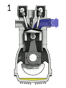 There are lots of different types of motor, but only two common sorts: the cheap, noisy and rather limited 2-stroke usually only found on small motorcycles and garden machines, and the more sophisticated Otto or 4-stroke used for cars, trucks and buses, which motor (pictured here) has a fun mnemonic, starting with the piston at the 'top' (but note: this is not always actually at the top, but - as in the picture left - that is how most folks call the end of the cylinder with the spark-plug or igniter which is also furthest from the 'bottom-end' or crankshaft):