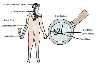 All of these sensors are then linked to these very thin wires, the neurons. These wires then send the pain signal through the spinal cord, the highway of the neurons, to the brain.[2]