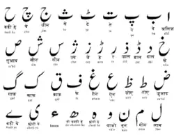 The Urdū alphabet, with names in the Devanāgarī and Latin alphabets