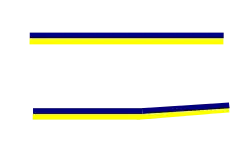 Before heating (above), the two strips are straight. However, after heating (below), the yellow metal expands more, so the strip bends.