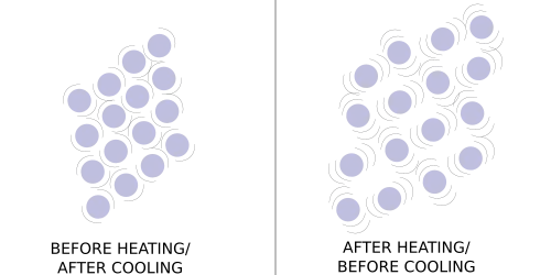 Do you remember, from the last chapter, that as heat made the particles move more vigorously, the volume of the air inside the balloon expanded and density of the air decreased? This is due to thermal expansion. When particles move more vigorously, they take up more space because they need more space for movement. See the diagram below.