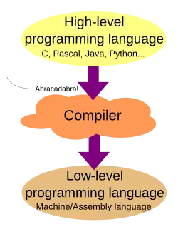 A high-level programming language is made to help human programmers communicate easily to the computer. These languages can have gentler learning curves and be very powerful. Good examples of high-level programming languages include C, Java, LISP, Smalltalk, PASCAL, LOGO, Visual Basic and Python. These languages are usually compiled, or converted into low-level programming languages so that they can be executed directly. The person who invented the concept of a compiler was Grace Hopper, sometimes called "Amazing Grace".