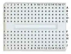 Each hole is identified with a notation system using numbers horizontally across the breadboard and letters vertically down the breadboard.