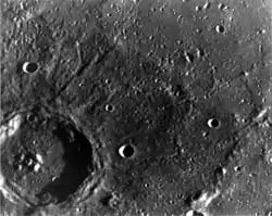 Mercury has craters like those on the Earth's moon. The largest crater on Mercury is the Caloris Basin. It is about 1300 km wide. It was created by a huge asteroid hitting Mercury. The asteroid was probably 100 km wide, but it hit Mercury's surface so hard that it made a much bigger hole.