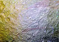There are two types of terrain on the surface. One is made of heavily cratered regions, and the other is made of a dark coloured, lightly cratered belt that extends across the surface of the moon. The light cratering of the region indicates that Tethys was once internally active, causing older terrain to resurface. The cause of the terrain's dark colour is unknown, but recent images of Ganymede and Callisto from the orbiter Galileo suggest that Tethys' surface might have been formed in a similar manner as these two moons, consisting of hazy polar caps of unresolved bright ice patches with a darker zone in between.