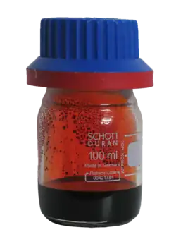 Bromine is a toxic, reddish-brown liquid at room temperature. It has a very strong odor that can irritate the eyes, lungs, and throat. It is hard to describe the smell but most people say that it smells like chemicals.