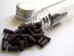 The word cadmium is an old word for zinc ore that was partly used in medieval and ancient times. It was made in 1817 independently by Friedrich Stromeyer and Carl Samuel Hermann from different zinc ores. It is used for solar cells, semiconductors, for nickel-cadmium batteries and also for the construction of control rods in nuclear power plants. Cadmium and cadmium compounds are highly toxic. Therefore, many applications are banned in the EU. From the 1950s, zinc mines in Japan discharged their wastewater into rivers that were used to irrigate rice paddies. The rice farmers fell ill. They experienced severe pain. Kidney failure and bone softening often led to death. Because of the severe pain, it was called "Aua-Aua disease" (Japanese "Itai-Itai disease").