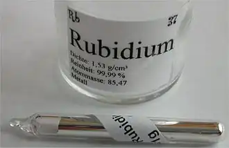 All atoms emit a light that is typical for them. Rubidium emits a purple-red light. Using this light, Robert Wilhelm Bunsen and Gustav Kirchhoff discovered rubidium in 1861. Bunsen then extracted 9 g of rubidium salt from 44,200 l of spring water. (The Latin word for red is "rubidus". This is also where the gemstone ruby got its name.) Rubidium is used for a few applications such as some vacuum tubes. Rubidium burns in air and explodes when quenched with water.