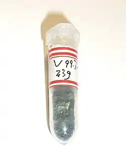 Pure vanadium is a shiny, silvery-gray metal. In its pure form, vanadium is ductile and malleable. It can be shaped or stretched without breaking. When impurities are present—especially carbon—vanadium becomes hard and brittle. It will snap or crack instead of bending. Vanadium and its compounds are sometimes toxic. They should never be tasted. Vanadium does not have a distinct smell. Some of its compounds release harmful vapors that should not be inhaled. Vanadium is not safe to handle directly. Scientists always use gloves, goggles, and special tools, such as a fume hood, tongs, and masks.