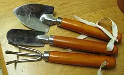![]() Gardening toolsUsing gardening tools is optional; most of your gardening can be done with your hands. It might help you to buy small gardening tools, and these can include a trowel which is a small shovel for moving big amounts of soil, a transplanter which can help dig narrow holes or move the roots of your plant, and a cultivator which can help make the soil loose. You may be able to use silverware like a spoon or a fork, if you don't want to buy special tools. There are other tools you can buy, but for most gardening, you will not need anything else.