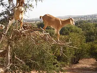 Goats are both wild and farm animals. A wild animal is one not owned by anyone, so no one trains it what to do. Farm goats are owned, raised, and taken care of by people but wild goats raise their own kids and live outdoors without any human help. Goats have pupils shaped like rectangles. They are also known to climb trees. Goats climb trees for safety to avoid animals that may eat them and to reach and eat the highest leaves. Goats can climb nearly anything even the Cingino Dam in Italy which is nearly a sheer wall.[1] Goats can eat a lot of different weeds that would hurt your tongue or make you sick such as thorns or poison ivy.[2] With the weeds gone farmers can grow vegetables instead or children can play where it wasn't fun to go before.