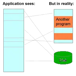 The program thinks it has a large range of contiguous addresses; but in reality the parts it is currently using are scattered around RAM, and the inactive parts are saved in a disk file.