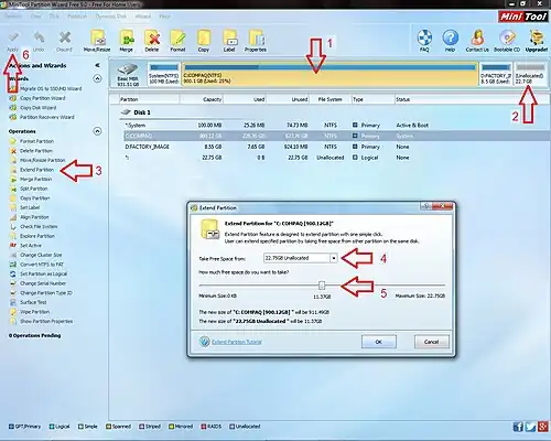 - Select the source of the space to use in making the extension of C:, using the drop-down list. (Choose Unallocated.) (4)