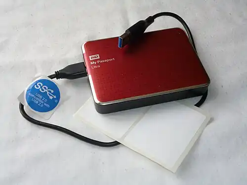 This particular drive has a 2 Terabyte, (2 x 1012), capacity and can work with USB 3 drivers for increased speed.