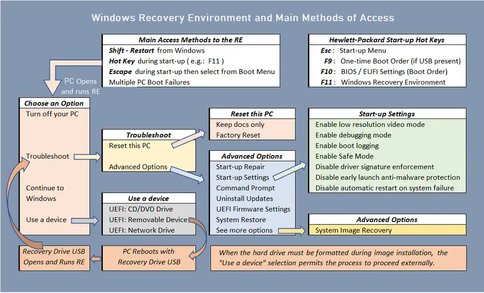 There is another situation where the system will insist on booting with alternative means. Recently an image made for Windows 11, version 21H2, was needed on a computer that had since been updated, and spoiled by, Windows 11, version 22H2. On attempting to install the image in RE via a restart with f11 during starup, the attempt failed with a notice that the host drive had to be entirely formatted and to use an external recovery or boot disc. (The exact message was: To restore this computer, Windows needs to format the drive that the Windows Recovery Environment is currently running on. To continue with the restore, shut down this computer and boot It from a Windows installation disc or a system repair disc and then try to restore again). Notice that these comments are based on recent experience with Windows 11, but no doubt apply elsewhere. The process to install an image for Windows 11 in such a circumstance is: