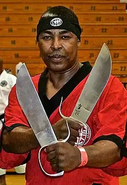 - Shift right and perform a Y-block, left sword in front. The blades are outward and the hooks are together