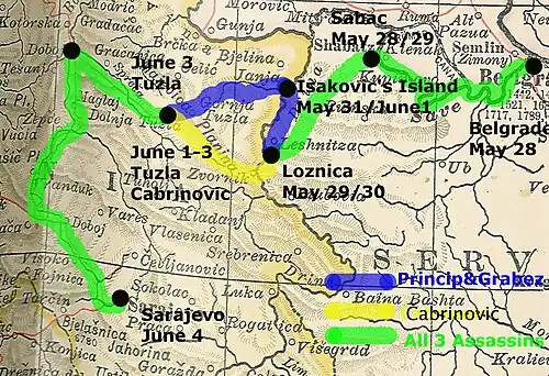 In Loznica, Princip and Grabež fell out with Čabrinović, who they believed to have been constantly failing to ensure security. As a result, he gave all his weapons to the other two members of the group and traveled to Tuzla alone (see illustration).