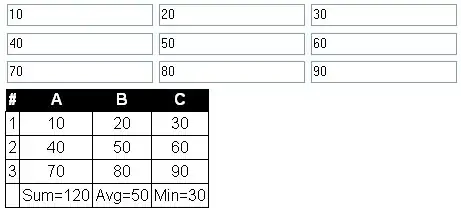 Note that top grid is actually just unlabeled input cells. Below that is a sample output inside a table. You should be able to change any of the input cells, enter a tab, and see the output and the footer calculations change.