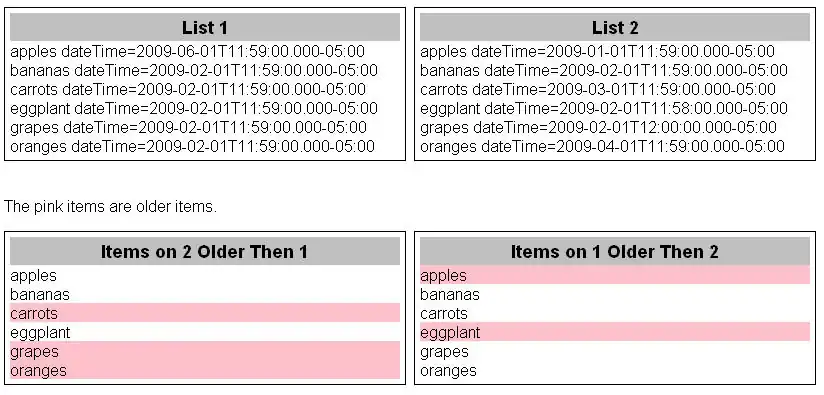 You have two identical lists of items with timestamps. You want to compare the items to see what items are newer.