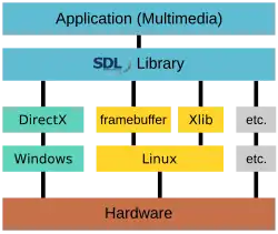 Simple DirectMedia Layer (SDL) is a cross-platform multimedia library written in C that creates an abstraction over various platforms' graphics, sound, and input APIs, allowing a developer to write a computer game or other multimedia application once and run it on many operating systems including GNU/Linux, Microsoft Windows and MacOS X. It manages video, events, digital audio, CD-ROM, sound, threads, shared object loading, networking and timers.