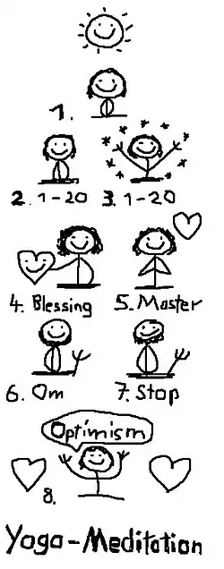 3. Mantra = We put our hands together in the lap, move our feet and think many times the mantra "Om Shanti" in our body, in our legs and in the whole world. We stop a minute every thought. We relax. Practice love, peace and wisdom. Send every day all people light. This is the way to become enlightenment und to live in the light (in happiness, in God).